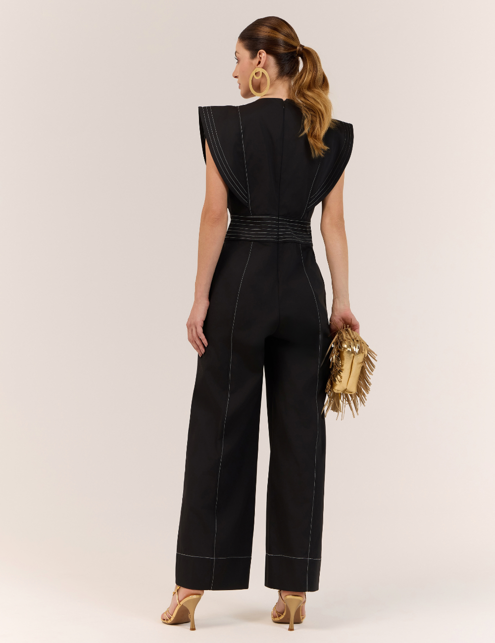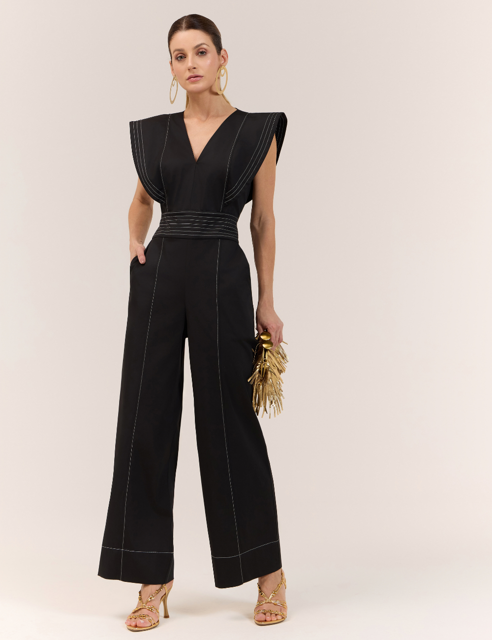 O macacão preto pespontado é confeccionado em algodão com poliéster. O tecido é estruturado e confortável, garantindo caimento impecável e sofisticação.