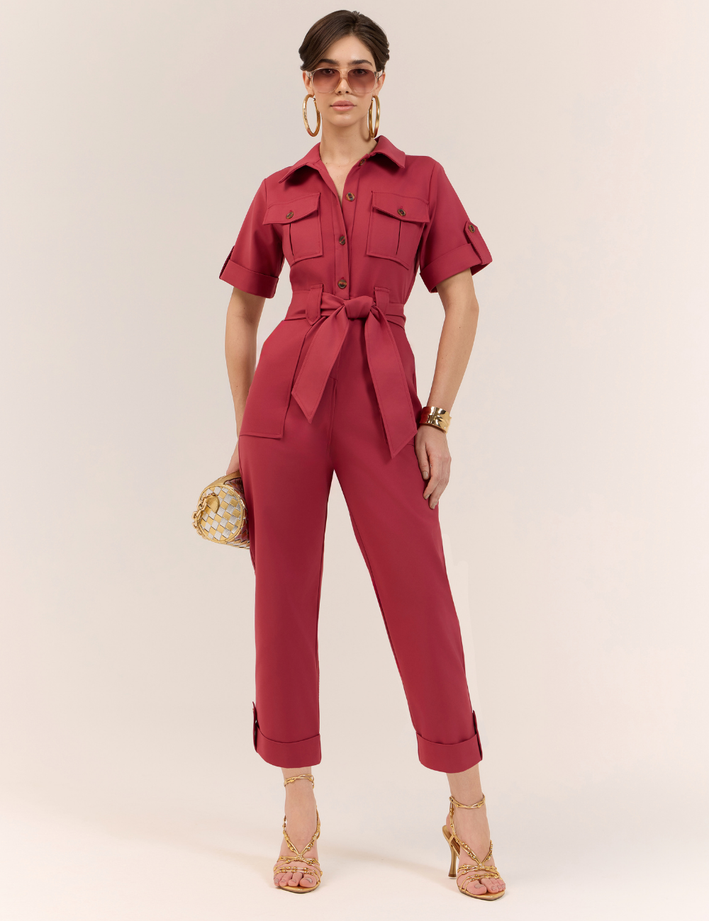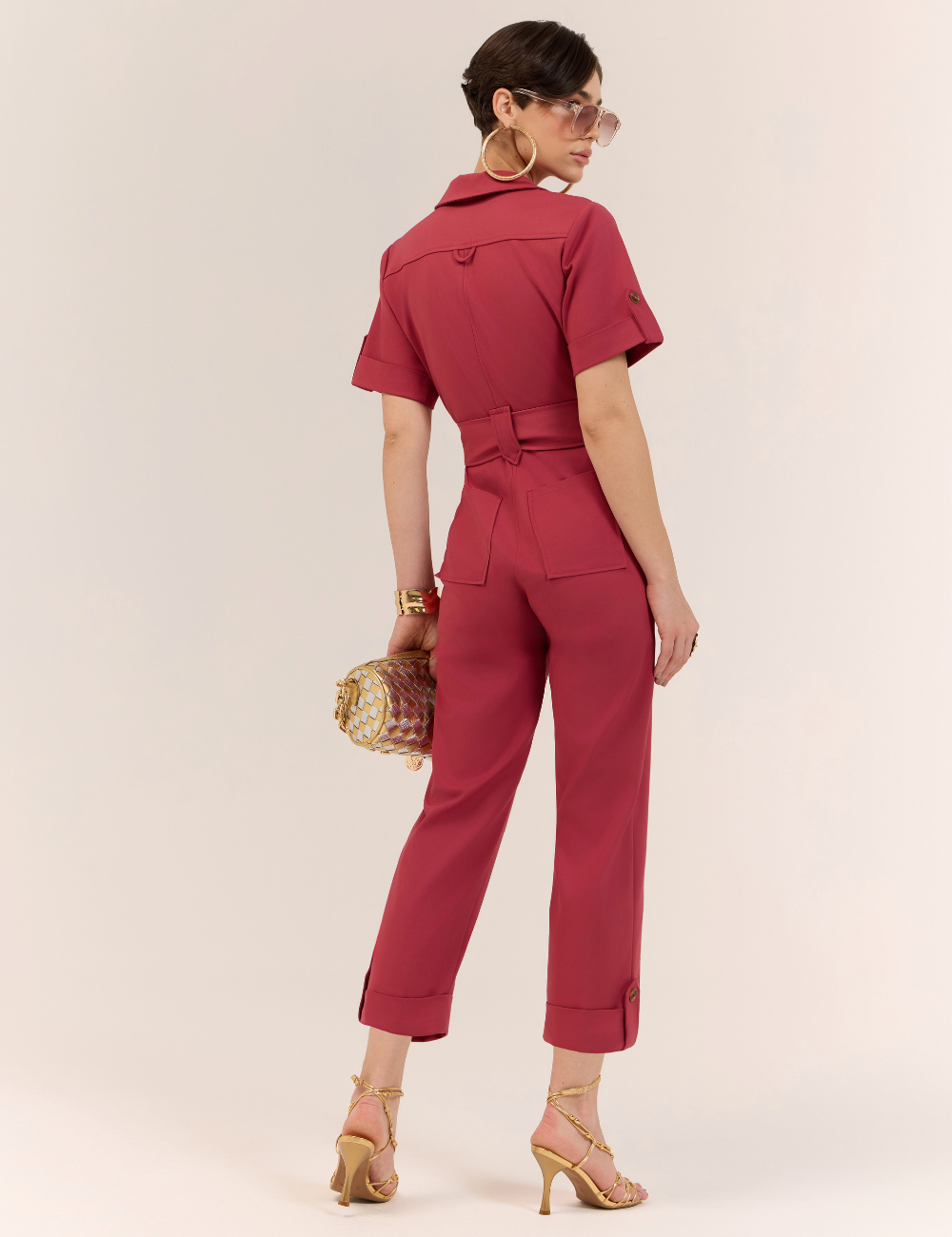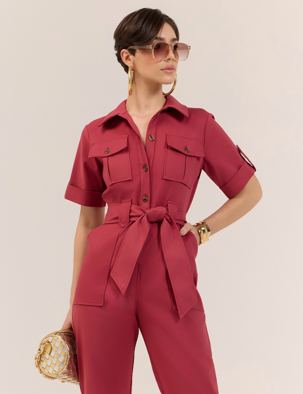 O macacão utilitário rosa é confeccionado em algodão com poliamida . O tecido é confortável e estruturado , conforto caimento moderno e elegante.