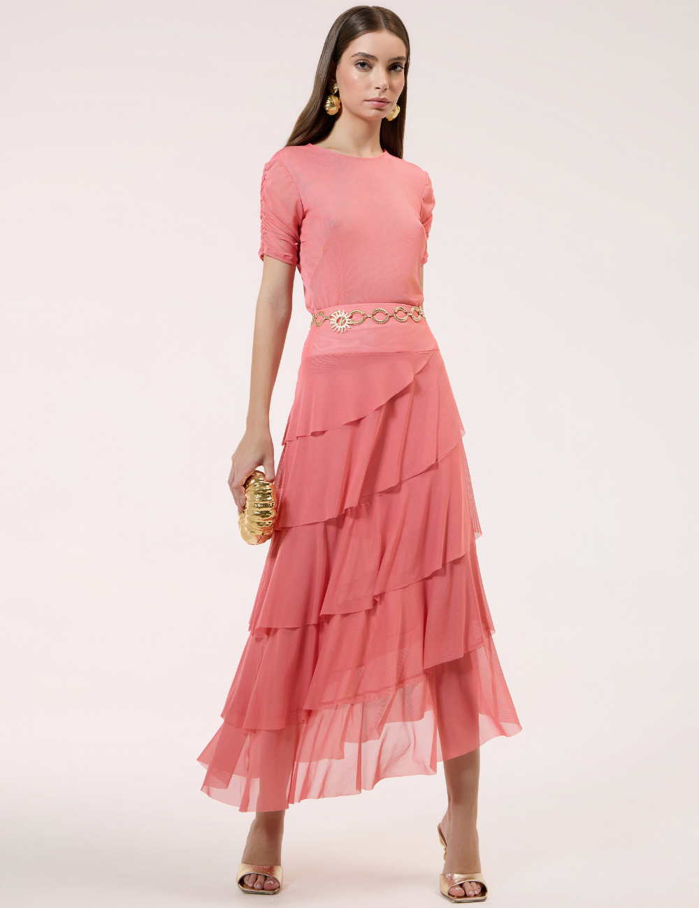 A saia longa coral em tule com babados é confeccionada em tule leve e com transparência, que traz fluidez e leveza ao visual. A peça se destaca pelos babados em camadas, que adicionam feminilidade, movimento e delicadeza à composição.