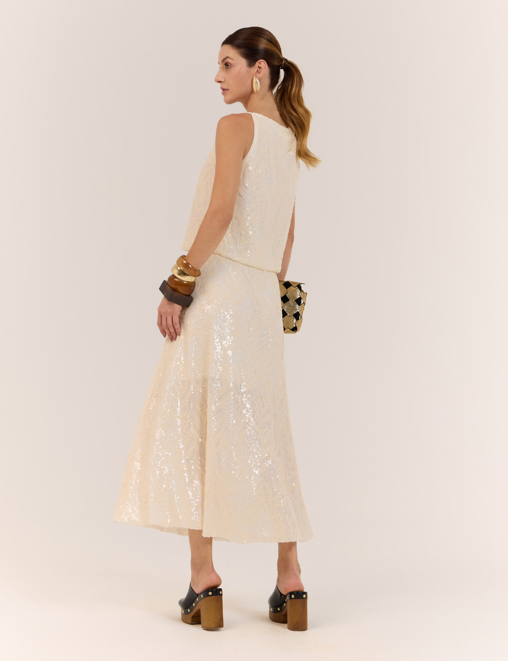 A saia midi off white em paetês é confeccionada em tule com paetês bordados, um tecido leve e confortável que oferece brilho sutil e caimento fluido.