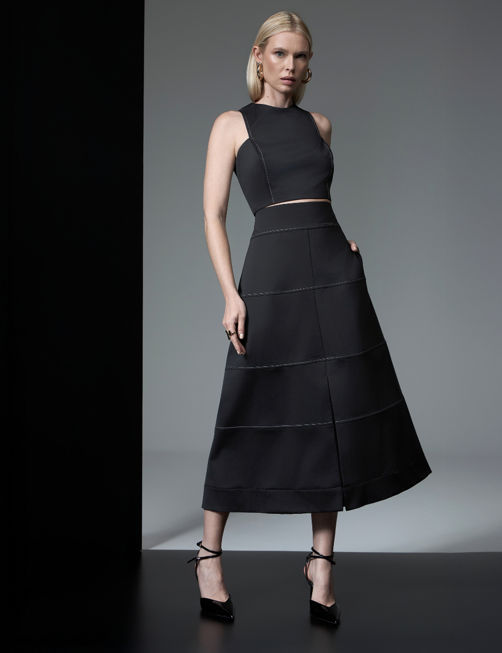 A saia midi pespontada preta é confeccionada em crepe alfaiataria, um tecido estruturado e confortável que garante elegância e sofisticação ao visual.
