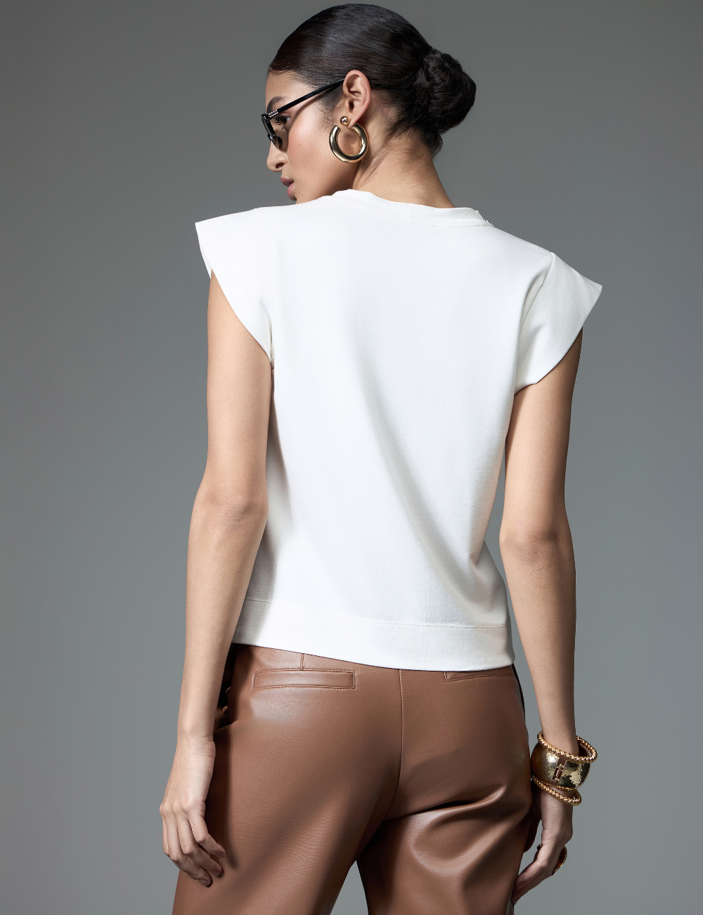 O modelo possui gola redonda, mangas curtas e detalhe do colar em strass, que adiciona um toque de modernidade e sofisticação à peça, elevando a proposta básica com informação de moda. Uma escolha perfeita para compor desde looks casuais até produções mais elaboradas.