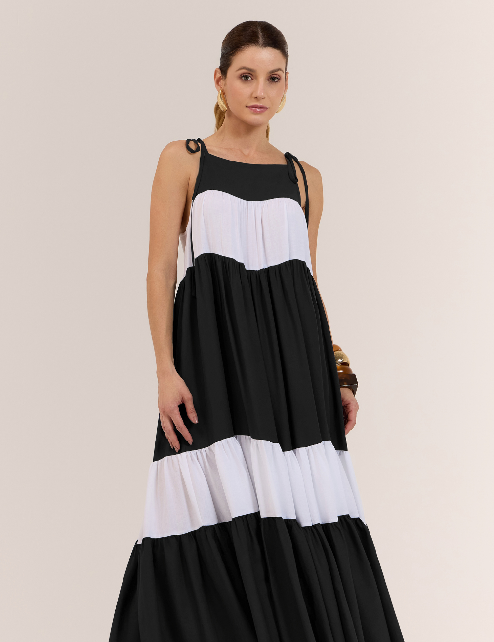 O vestido longo bicolor é confeccionado em viscose, um tecido leve e confortável que oferece movimento e fluidez ao look. A peça se destaca pelo shape amplo e fluido, garantindo conforto e leveza em cada detalhe.