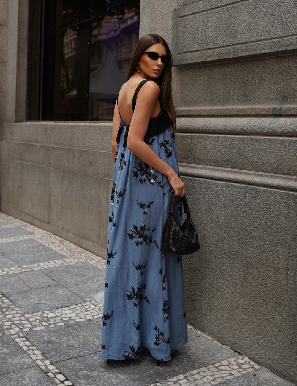 Apresenta modelagem evasê, comprimento longo e shape amplo, garantindo caimento fluido e confortável. Possui alças largas, decote reto e forro embutido, que oferecem segurança e elegância ao vestir. O fechamento é feito por zíper invisível nas costas, garantindo acabamento discreto.