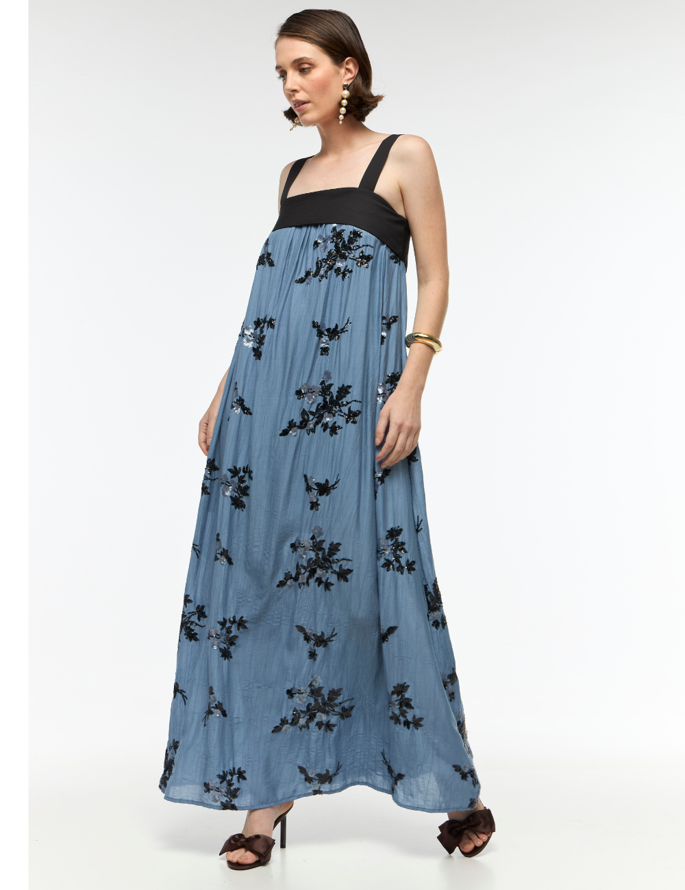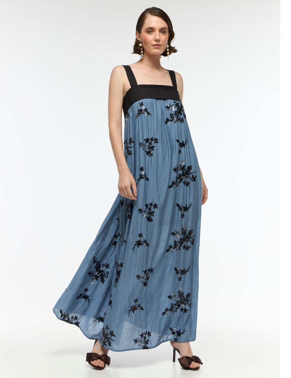 O vestido longo com paetês bordados é confeccionado em viscose com toque delicado e visual sofisticado. O tecido se destaca pelos bordados em paetês, que proporcionam feminilidade e um brilho sutil à peça, tornando-a ideal para ocasiões especiais.