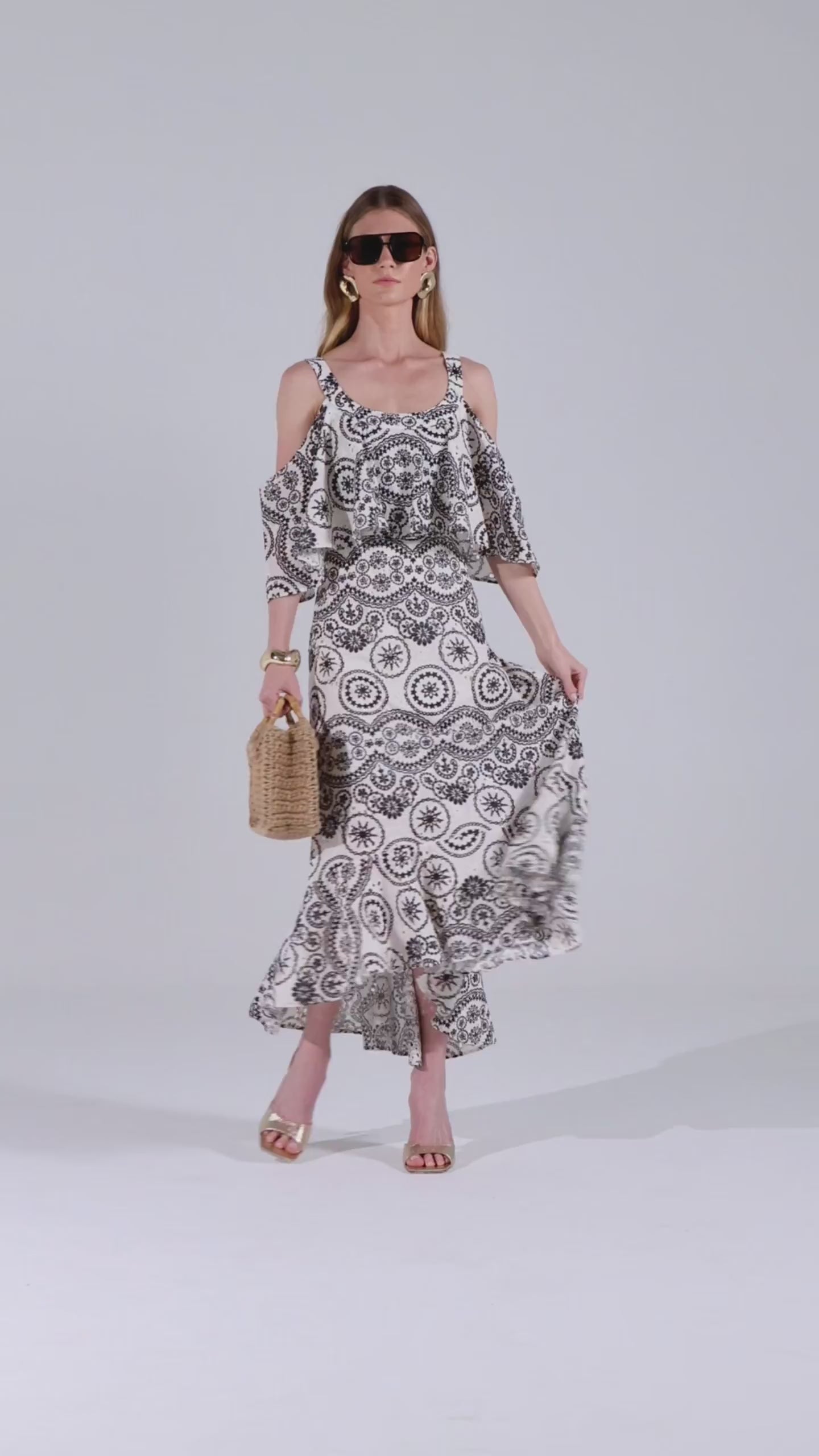 Modelagem longa com saia evasê fluida