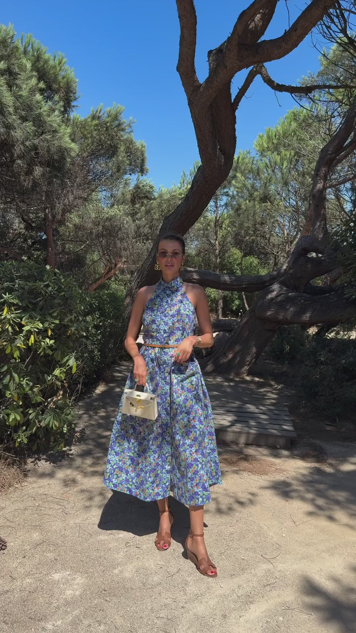 Vestido Longo Floral Azul com Bolsos
