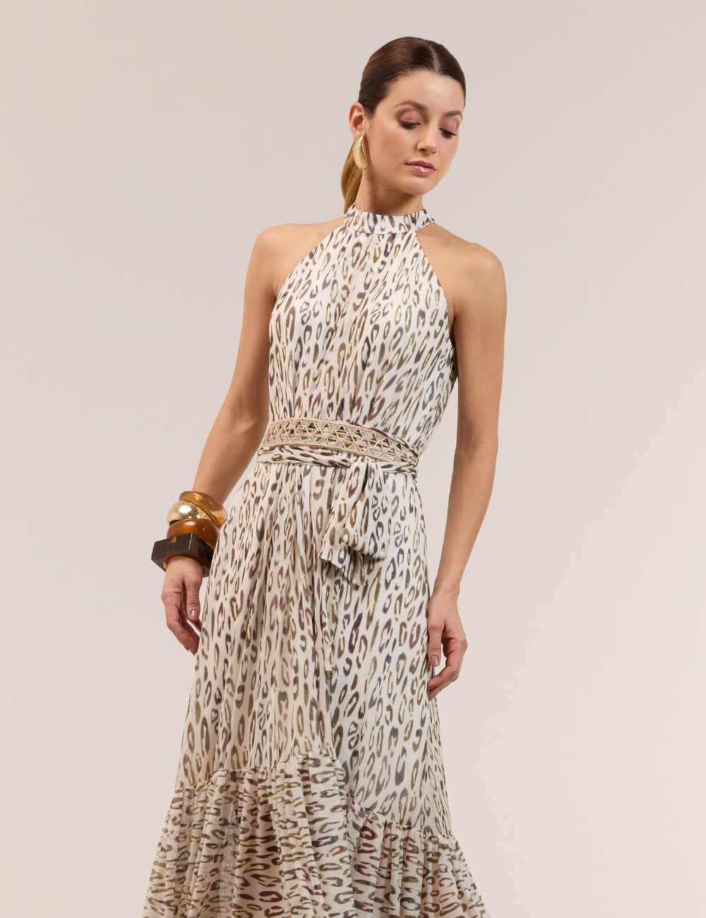 Apresenta modelagem evasê e comprimento midi, com gola halter, shape amplo e recorte na saia, garantindo caimento leve e sofisticado.