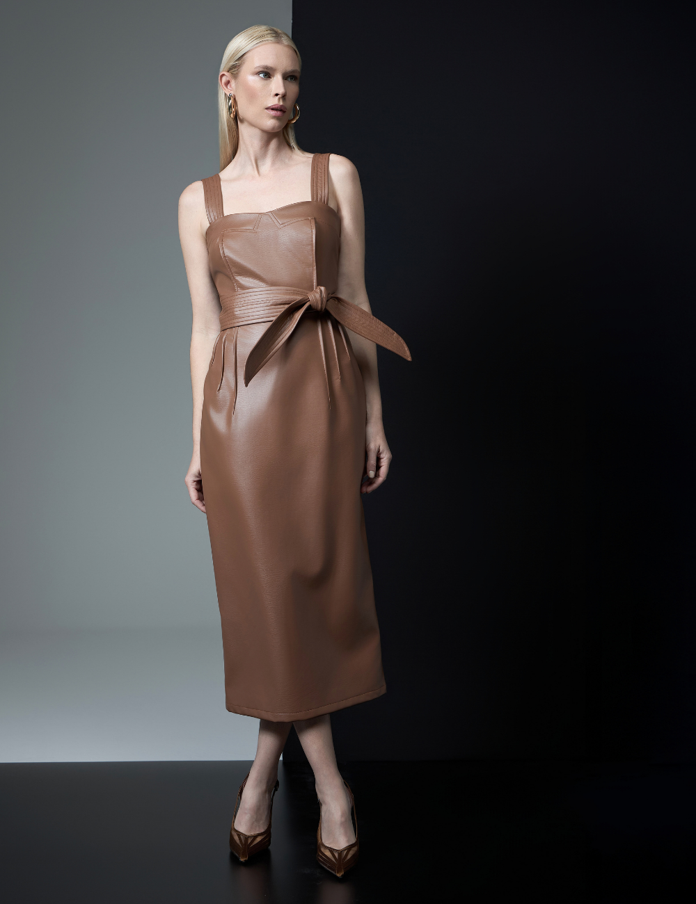 O vestido midi caramelo é confeccionado em material sintético. O tecido estruturado e confortável garante caimento impecável e valoriza a silhueta com elegância.