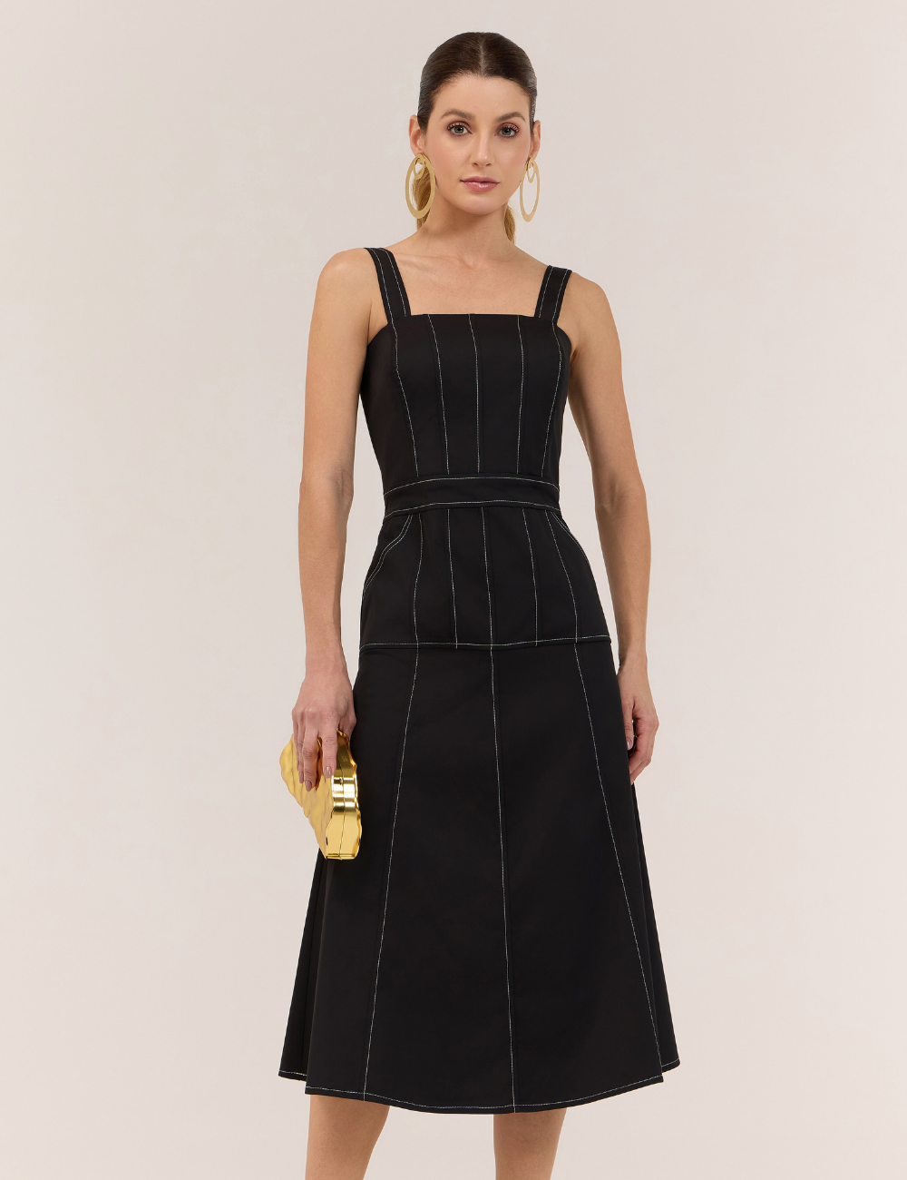O vestido midi preto pespontado é confeccionado em algodão com poliéster. O tecido é estruturado e confortável, garantindo caimento impecável e sofisticação.