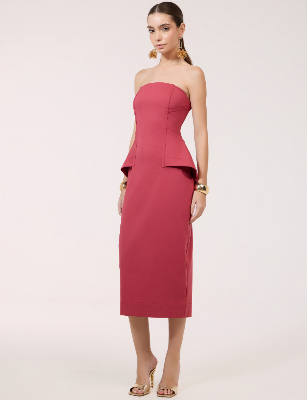 A peça apresenta modelagem justa e comprimento midi, com estrutura sem alças e barbatanas internas, que proporcionam sustentação ao busto. Conta com recortes estratégicos, basque no quadril e forro embutido para um acabamento refinado. Nas costas, o detalhe em lastex garante melhor adaptação ao corpo, enquanto a fenda na saia adiciona charme e liberdade de movimento. O fechamento é feito por zíper invisível, conferindo um visual limpo e sofisticado.