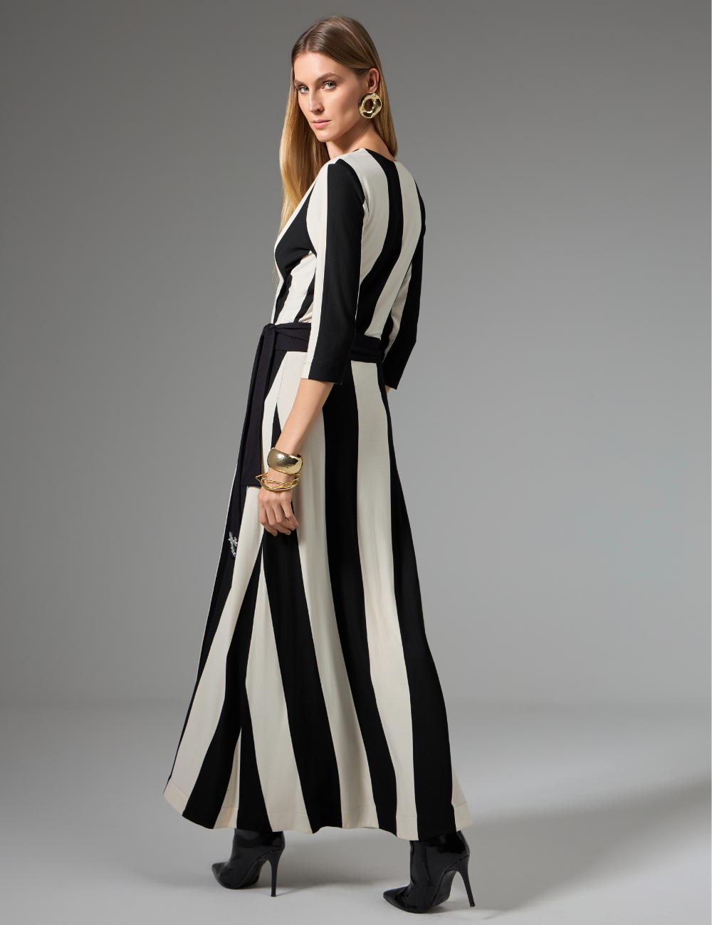 O vestido midi transpassado listrado é confeccionado em viscose com elastano , garantindo leveza, conforto e caimento fluido. O destaque fica pela conta da estampa listrada e pelo detalhe em strass aplicado na faixa da cintura , que traz um toque de brilho e modernidade ao visual.