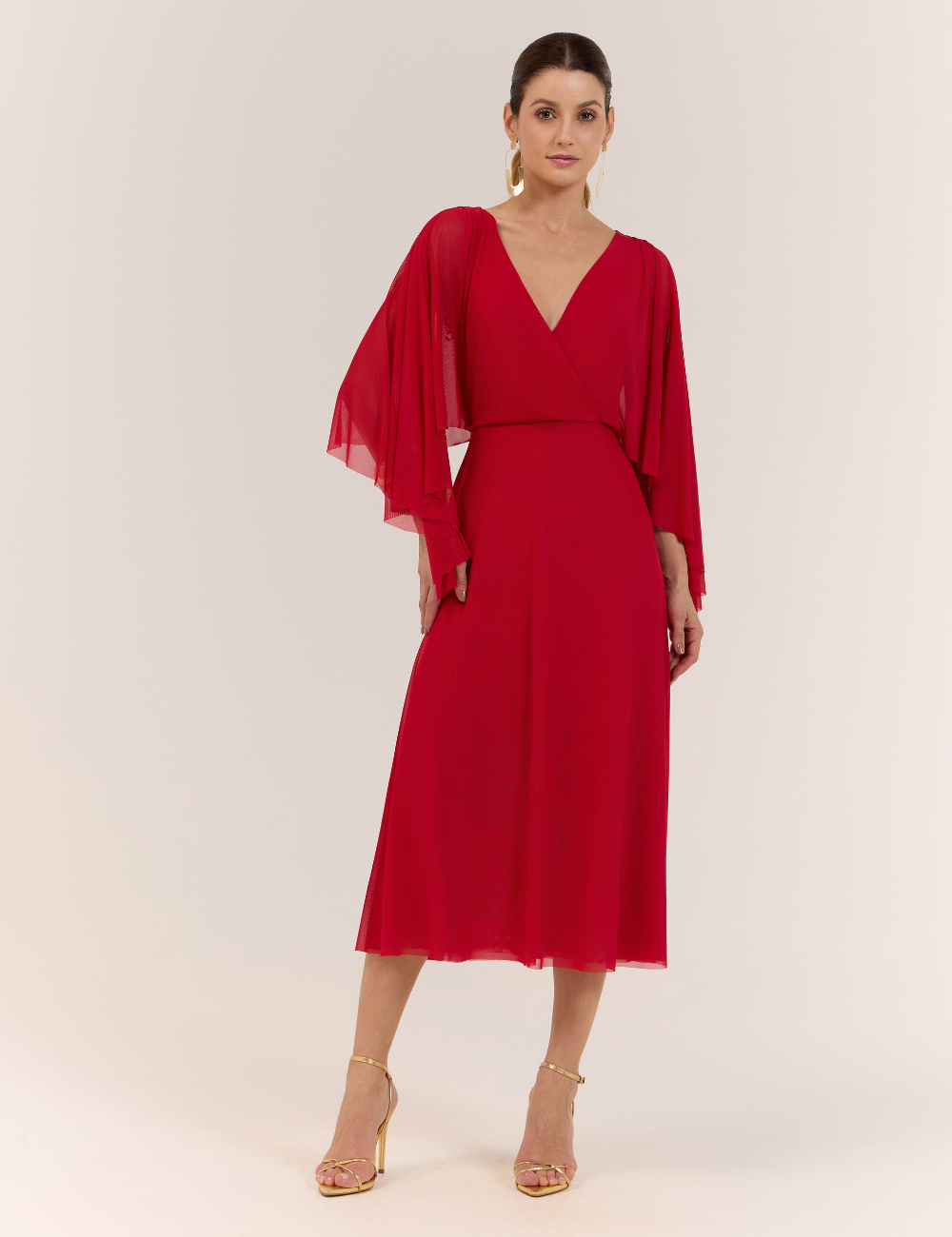 O vestido midi vermelho transpassado é confeccionado em tule. O tecido é confortável e possui leve transparência, garantindo um visual delicado e sofisticado. Apresenta modelagem evasê e comprimento midi, valorizando o movimento natural da peça. Possui mangas amplas com leves franzidos e babados, que trazem leveza ao look, além de decote em V transpassado, elástico na cintura para melhor adaptação ao corpo e forro embutido.