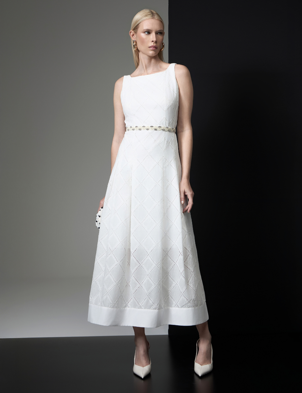 O vestido off white com bordados e pérolas é confeccionado em algodão . O tecido é leve e confortável , destacando-se pelos bordados delicados que conferem sofisticação à peça.